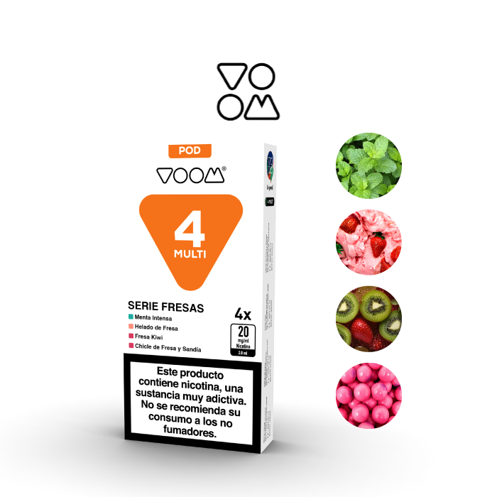 Estuche 4 cápsulas VOOM MULTI POD 2400 caladas o puffs  que incluye 4 sabores con 2% nicotina. STRABERRY SERIE: MENTA | HELADO DE FRESA | FRESA KIWI | CHICLE DE FRESA Y SANDÍA.