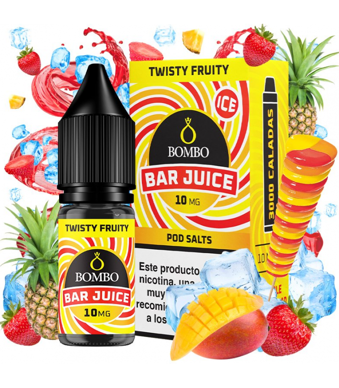 El líquido Twisty Fruityde Bar Juice by Bombo está inspirado en el clásico helado, un remolino refrescante de frutas tropicales y dulces.