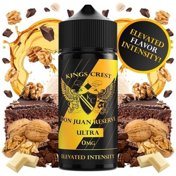 El aroma Don Juan Reserve Ultra en formato Longfill de Kings Crest sorprende por su sabor a tarta de chocolate recubierta con mantequilla de nueces pecán y crema batida, ahora con una intensidad de sabor todavía mayor.
