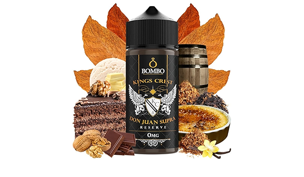 El aroma Don Juan Supra de Kings Crest & Bombo en formato Longfill, fusiona los dos sabores más laureados: Don Juan Reserve + Supra Reserve. Tarta de chocolate con galletas, mantequilla de nueces pecanas y crema batida que, sumado al tabaco dulce acaramelado y tostado, ofrece el sabor definitivo.